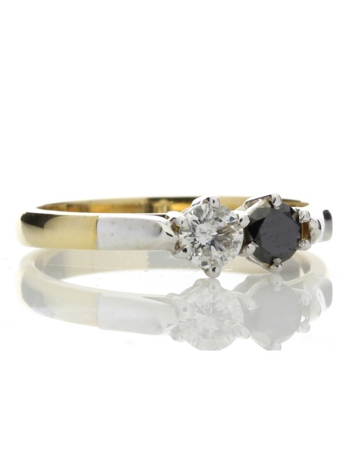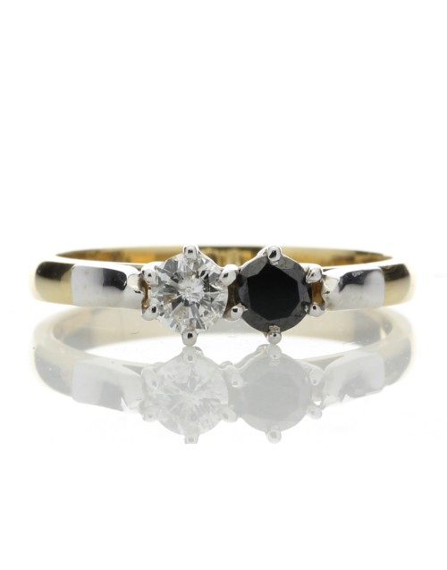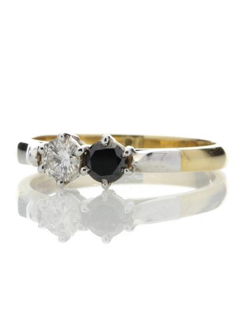 Two diamonds are set in this unique 18ct yellow gold engagement ring. Set with one natural round brilliant cut diamond and with one round black treated diamond. This ring is set in an elegant 18ct yellow gold ring with a white gold setting.