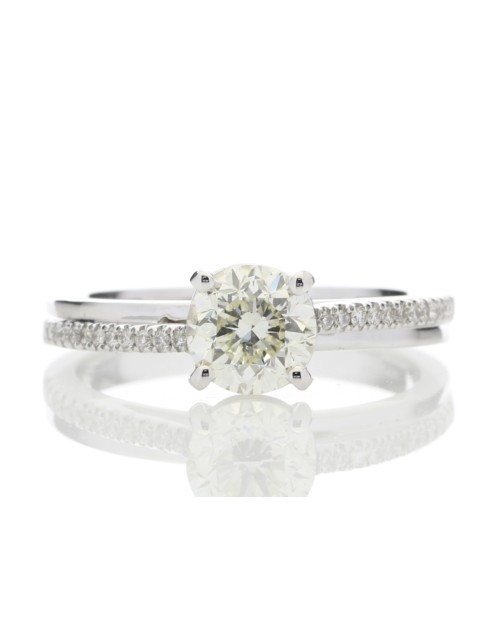 A beautiful natural round brilliant cut diamond 1.00 carats, set in a unique 18ct white gold ring. The ring has a groove across the width giving the look of two separate bands and has diamonds set on opposite sides of the centre diamond in a crossover illusion style setting. The total diamond weight is 1.11 carats.